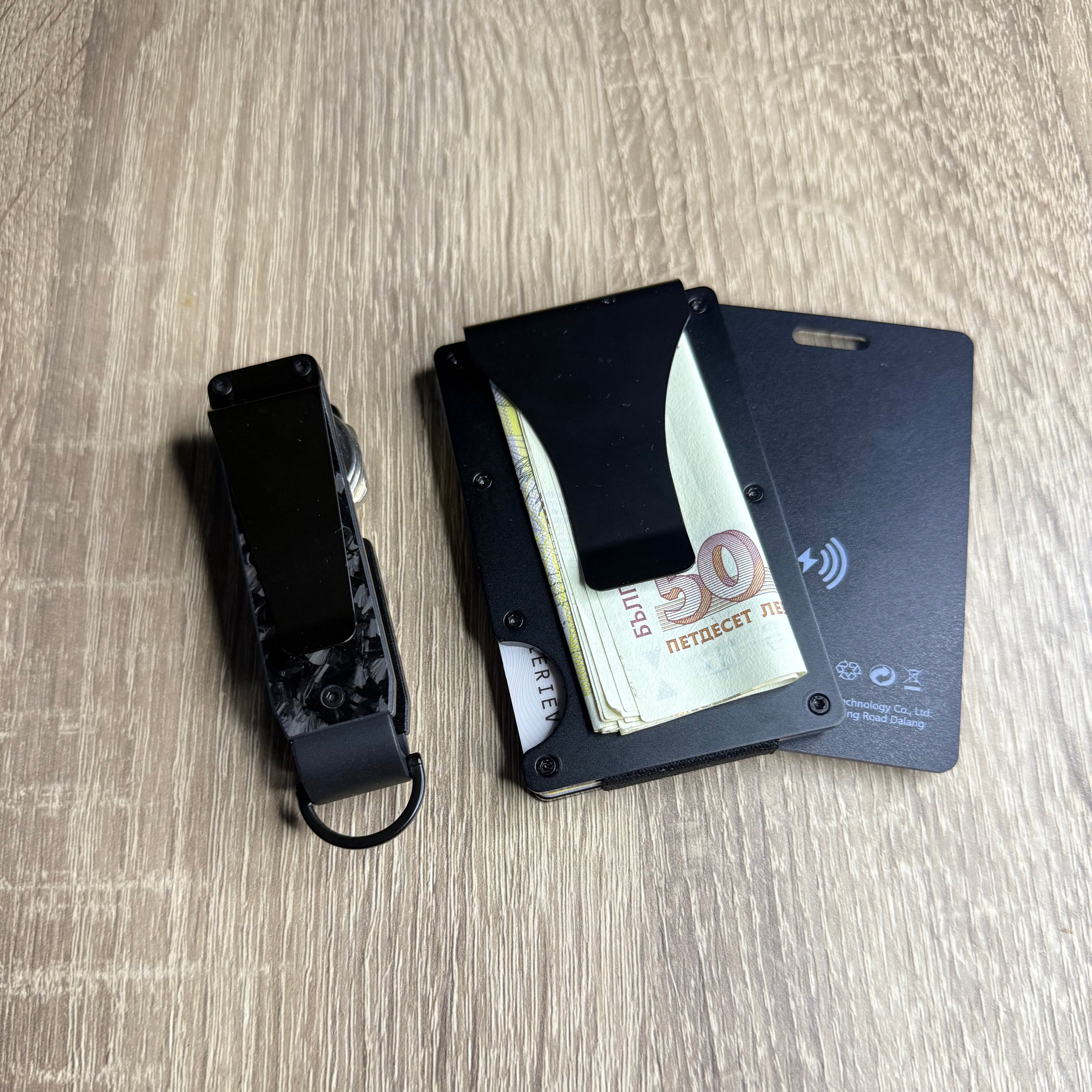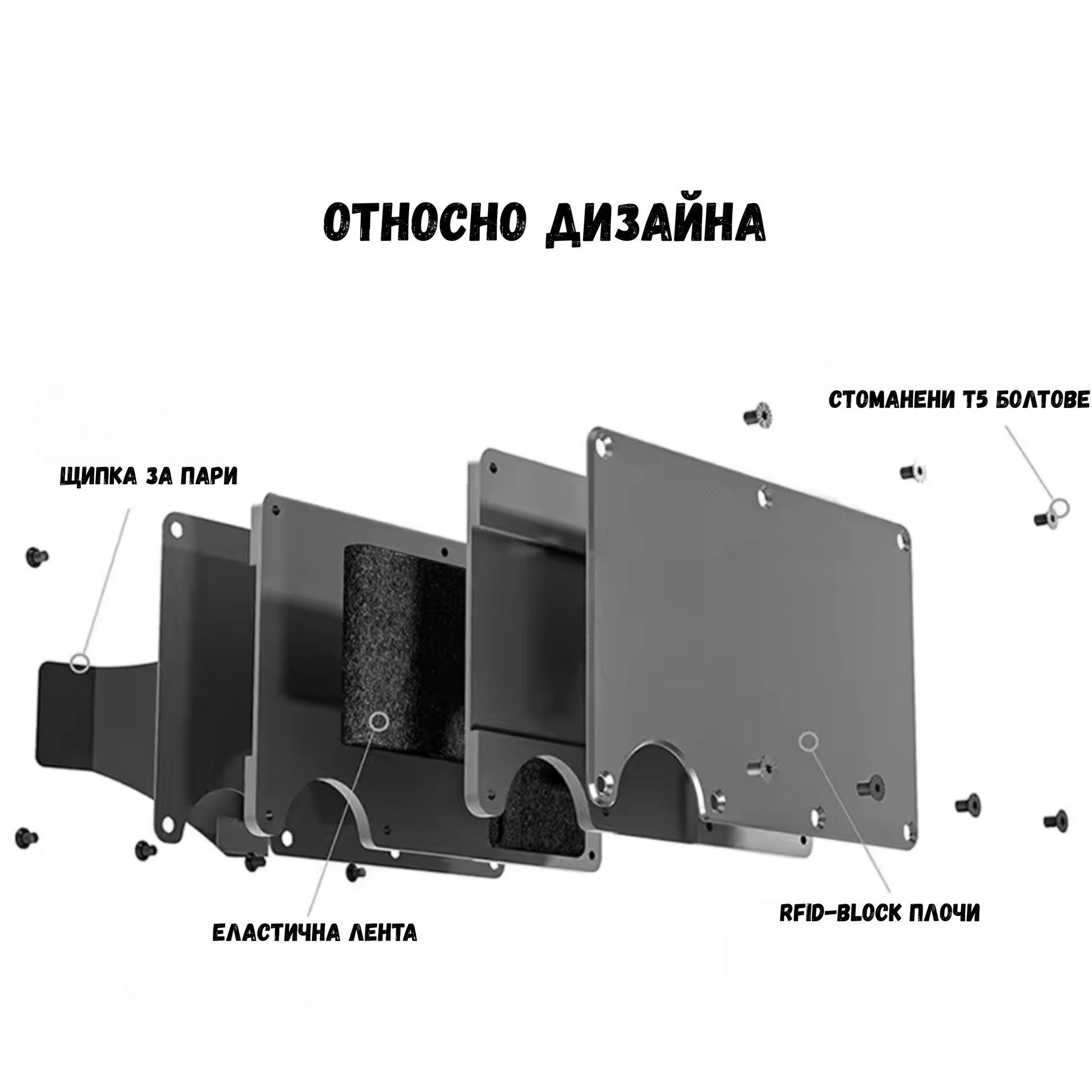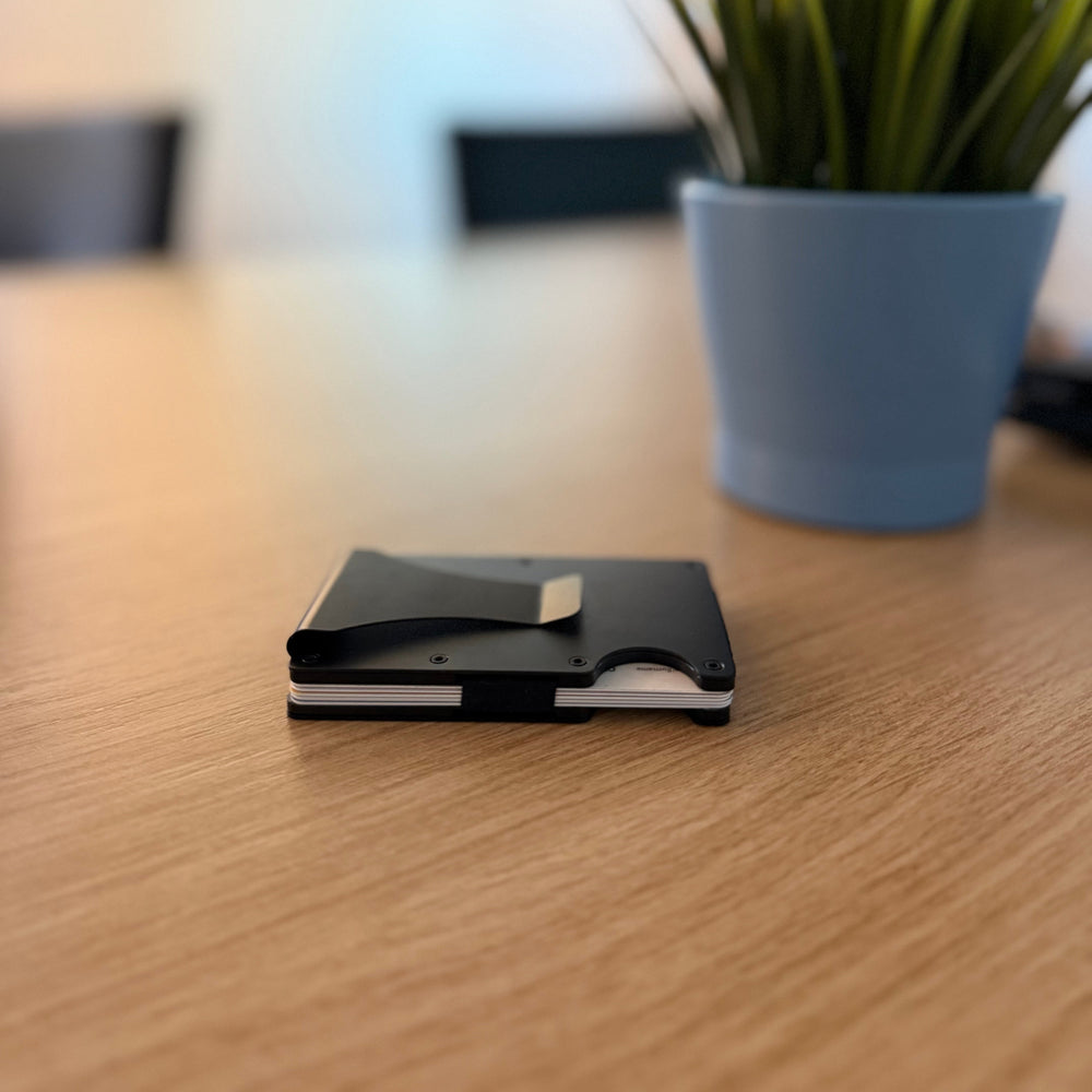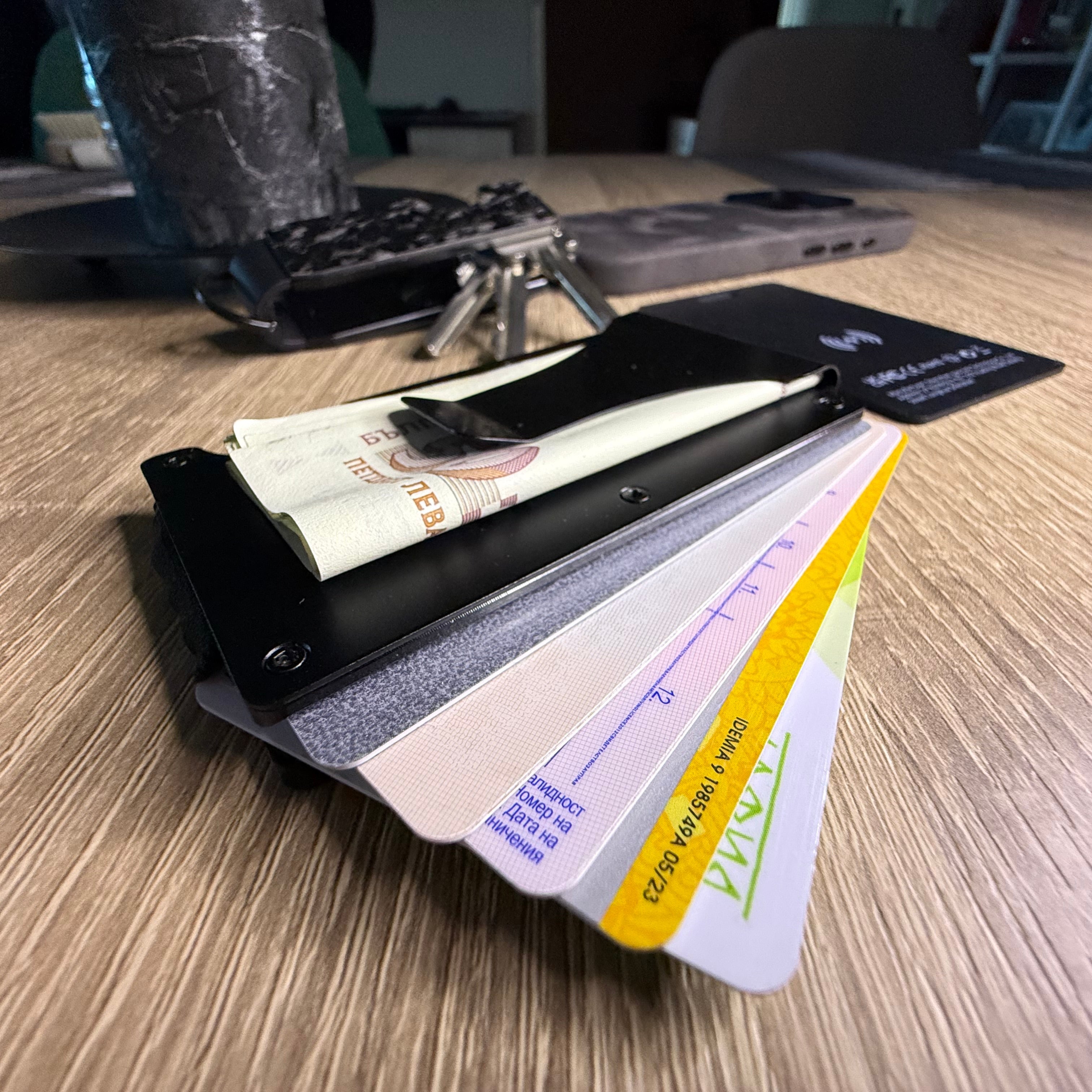 Изработен от здрав алуминиев корпус с черен матов финиш, MetalWallet побира до 12 карти, които стоят стегнато и защитено. Благодарение на вградения RFID блокер, си сигурен, че личните ти данни са в безопасност. Металното тяло предпазва съдържанието от физически повреди, а щипката за пари осигурява място за банкноти – без нужда от отделно портмоне.